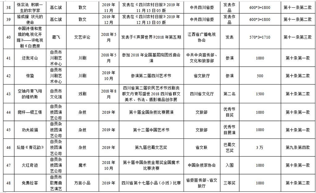2020年度自贡市拟补助优秀文艺作品名单