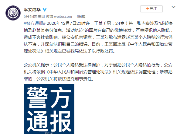 据@平安成华 消息,12月7日23时许,王某(男,24岁)将一张内容涉及“成都疫情及赵某某身份信息、活动轨迹”的图片在自己的微博转发,严重侵犯他人隐私,造成不良社会影响。经公安机关调查,王某对散布泄露赵某某个人隐私的行为供认不讳,并深刻认识到自己的错误。目前,王某因违反《中华人民共和国治安管理处罚法》相关规定已被我局依法予以行政处罚。