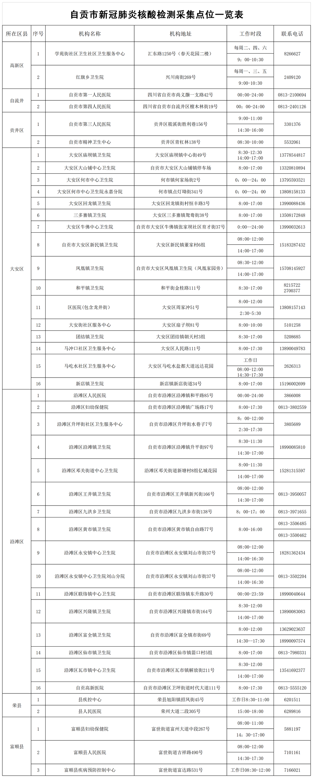 12月10日,记者从市卫健委获悉,目前,全市新冠肺炎核酸检测采集点共43家。其中,高新区2家、自流井区2家、贡井区2家、大安区16家、沿滩区16家、荣县2家、富顺3家(文末附自贡市新冠肺炎核酸检测采集点位一览表)。