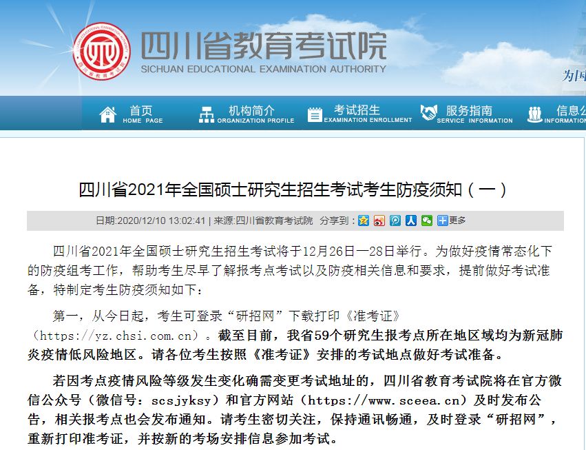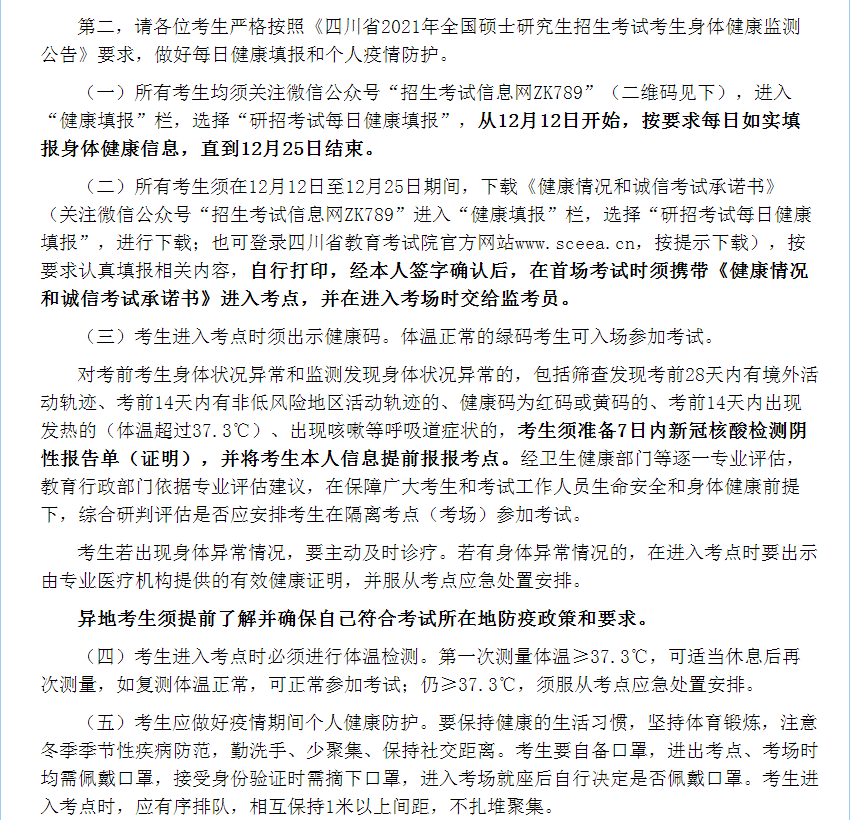 据四川省教育考试院,截至目前,四川59个考研考点均为低风险地区。从12月12日开始,所有考生均须关注微信公众号“招生考试信息网ZK789”,进入“健康填报”栏,选择“研招考试每日健康填报”,从12月12日开始,按要求每日如实填报身体健康信息,直到12月25日结束。