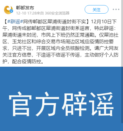 12月10日下午,网传成都郫都区犀浦街道封街系谣言,特此辟谣:犀浦街道未封闭,市民上下班仍然正常通勤。仅犀池社区、玉龙社区和综合交易市场周边区域应疫情防控要求,只进不出,开展区域内全员核酸检测。请广大网友关注官方信息,不造谣不信谣不传谣,主动做好个人防护,配合疫情防控。(封面新闻记者 秦怡)