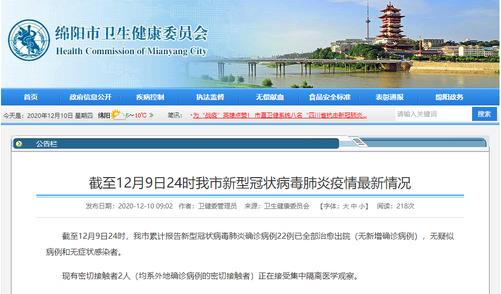 10日当天上午,绵阳市卫健委已发布《截至12月9日24时我市新型冠状病毒肺炎疫情最新情况》。根据该通报,截至12月9日24时,绵阳市累计报告新型冠状病毒肺炎确诊病例22例已全部治愈出院(无新增确诊病例),无疑似病例和无症状感染者。现有密切接触者2人(均系外地确诊病例的密切接触者)正在接受集中隔离医学观察。(封面新闻记者 周洪攀)