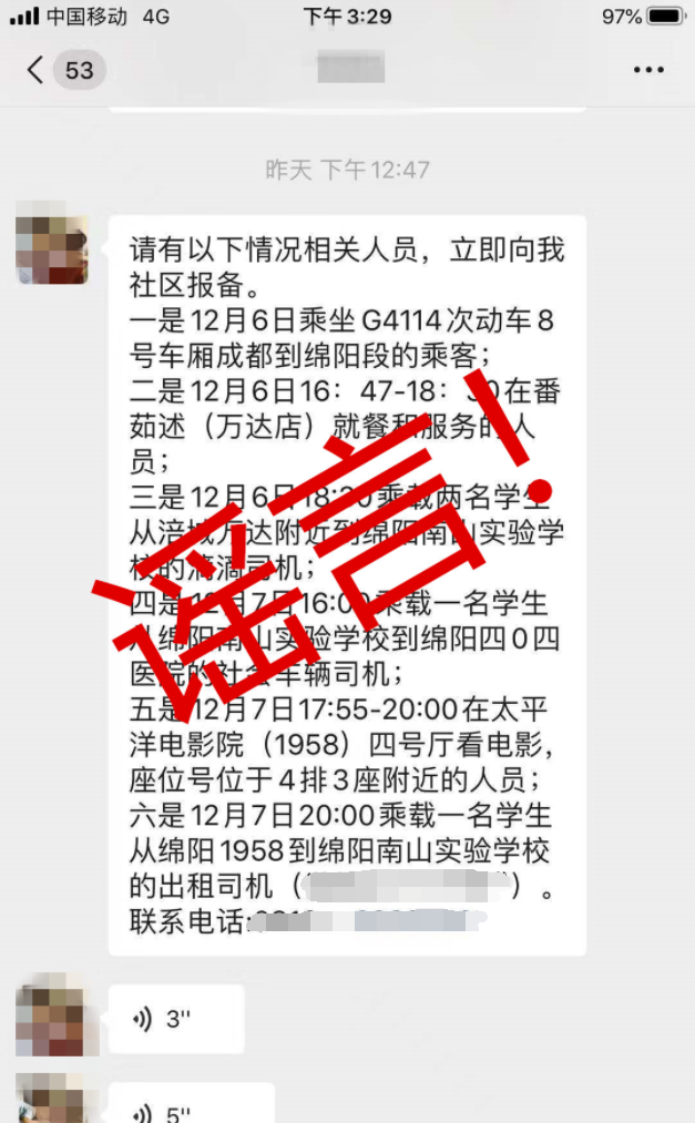 该消息原文为:“接区防控指挥部通知,请各社区摸排本社区是否有以下相关人员或去过以下地方的人员,如有请立即登记相关信息并上报街道。一是12月6日乘坐G4114次动车8号车厢成都到绵阳段的乘客;二是12月6日16:47-18:30在番茹述(万达店)就餐和服务的人员;三是12月6日18:30乘载两名学生从涪城万达附近到绵阳南山实验学校的滴滴司机;四是12月7日16:00乘载一名学生从绵阳南山实验学校到绵阳四0四医院的社会车辆司机;五是12月7日17:55-20:00在太平洋电影院(1958)四号厅看电影,座位号位于4排3座附近的人员;六是12月7日20:00乘载一名学生从绵阳1958到绵阳南山实验学校的出租司机(微信名XXX)。请各社区收到通知马上落实好此项工作。”