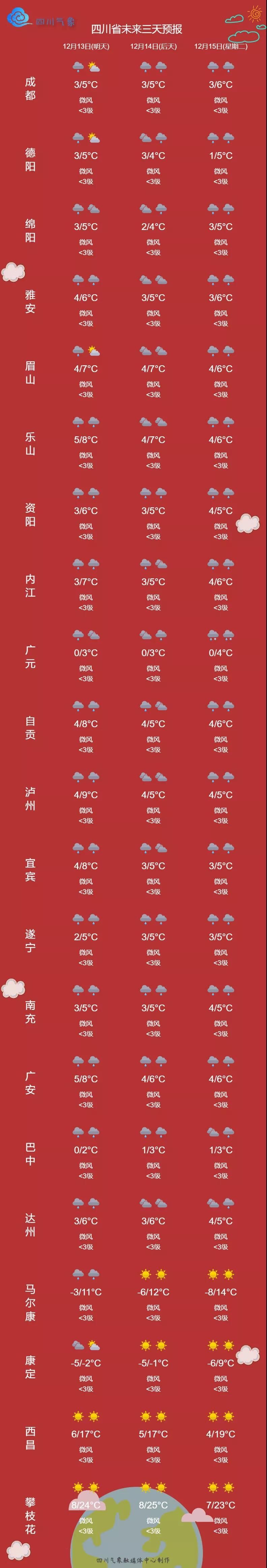 今天白天:盆地各市阴天有小雨;甘孜州北部和阿坝州大部阴天间多云有分散阵雪(雨),川西高原其余地方和攀西地区晴间多云。24小时内,盆地最低气温:北部2-5℃,南部5-7℃;最高气温:7-10℃。