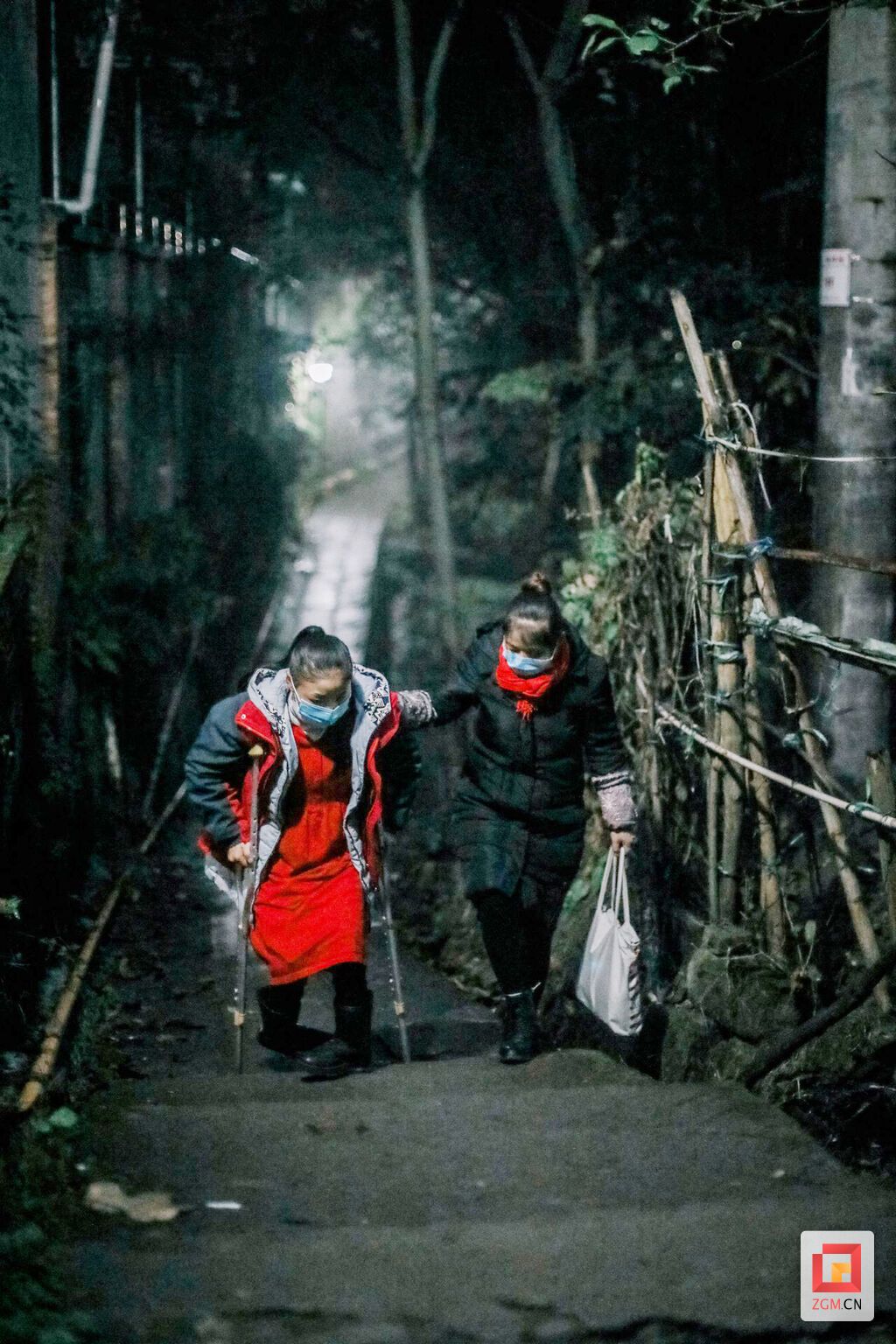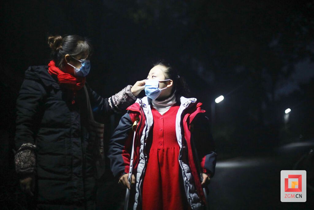 12月10日,活动结束后第5天,清晨7点,天蒙蒙亮,位于桃花山一处民房的铁门“咿呀”一声打开,一名穿着校服拄着双拐的女孩和她的母亲鱼贯而出。经过一段上坡,女孩停下来歇息了片刻,在路灯的照射下额头冒出阵阵热气。
