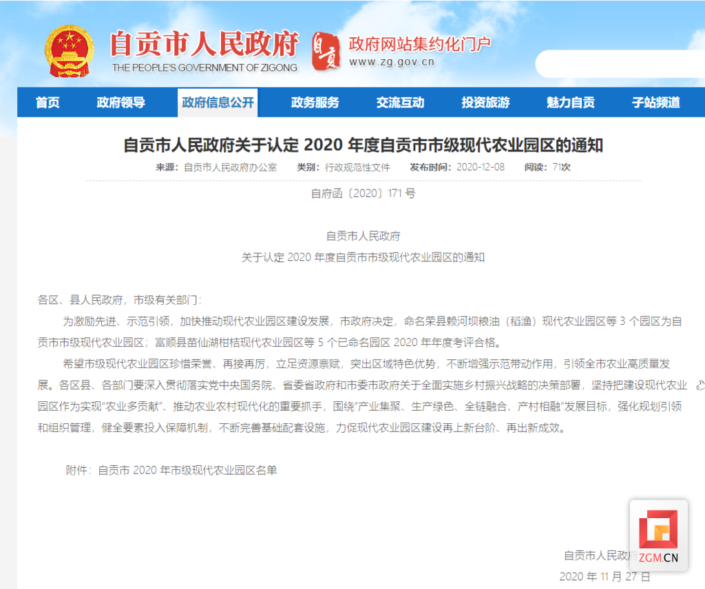 日前,自贡市人民政府发布了《关于认定2020年度自贡市市级现代农业园区的通知》,认定荣县赖河坝粮油(稻渔)现代农业园区、沿滩区九洪花椒现代农业园区和荣县双石生猪种养循环现代农业园区为2020年市级现代农业园区,进一步激励先进、示范引领,加快推动现代农业园区建设发展。