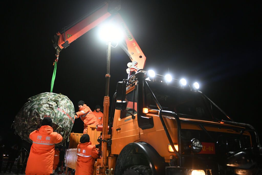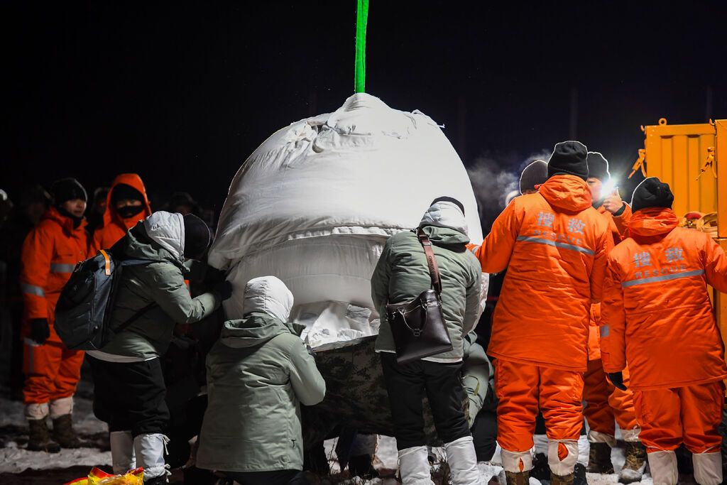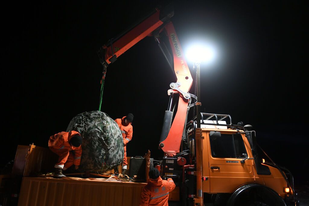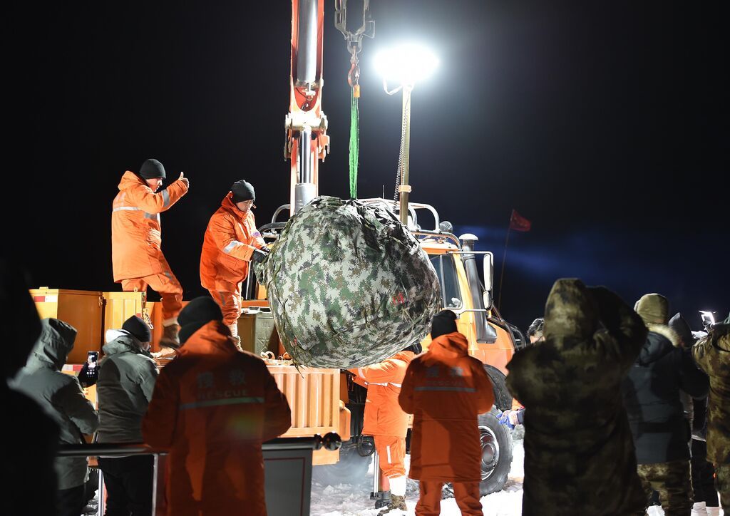 ↑12月17日,工作人员在搬运嫦娥五号返回器。