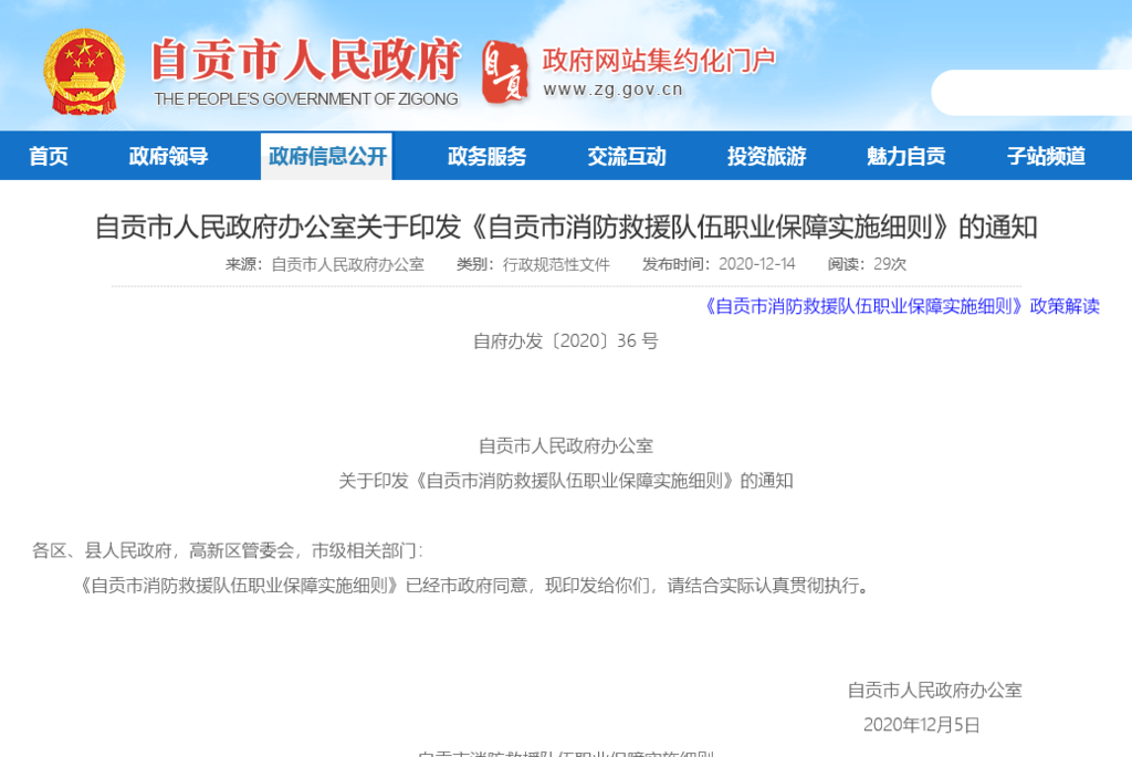 近日,《自贡市消防救援队伍职业保障实施细则》(以下简称《实施细则》)经市政府同意并印发。《实施细则》围绕贯彻落实中央和省委、省政府部署,加强我市消防救援队伍建设,结合我市实际,进一步明确各地各部门的职责任务,切实推动我市消防救援人员优待工作落到实处。
