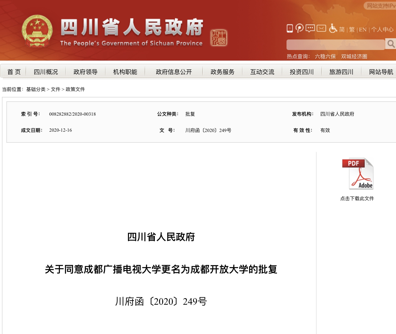 12月17日,四川省人民政府官方网站公布四川省人民政府关于同意成都广播电视大学更名为成都开放大学的批复。