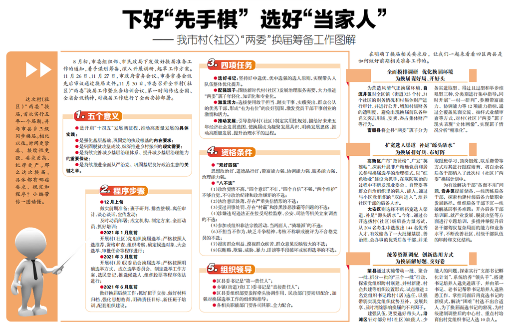 8月初,市委组织部、市民政局下发做好换届准备工作的通知,着手谋划筹备,深入开展调研,起草工作方案。11月26日、11月27日,市政府常务会议、市委常委会议先后审议通过换届文件。11月30日,市委召开全市村(社区)“两委”换届工作暨业务培训会议,第一时间传达全国、全省会议精神,对换届工作进行了全面安排部署。
