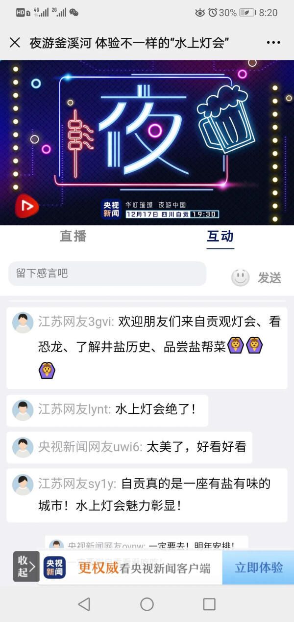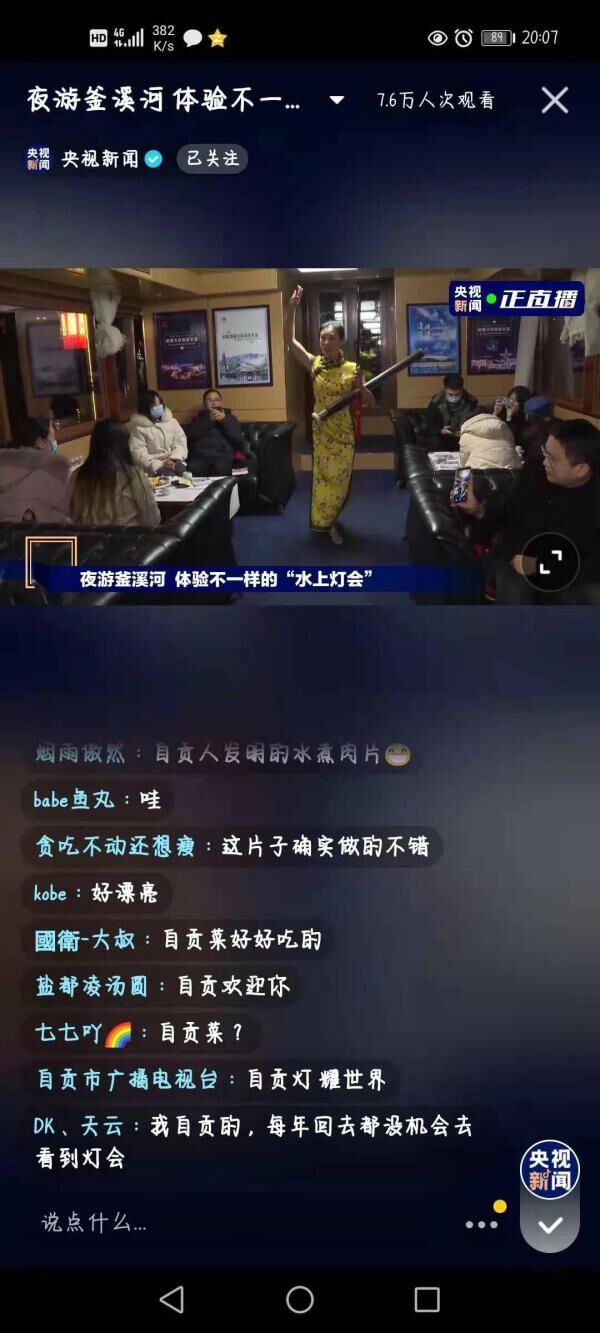 12月17日晚,央视记者通过直播带领网友在自贡釜溪河上夜游釜溪,在两岸光影交错中品读历史、品味人文,感受不一样的水上灯会。