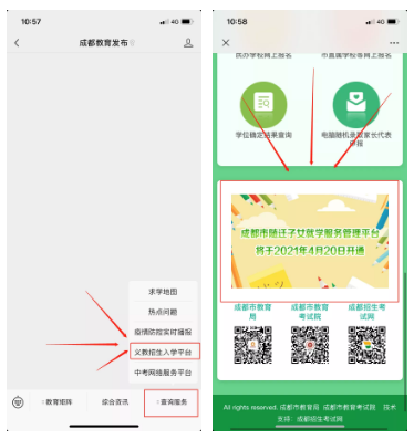 2021年4月20日起,家长可以关注微信公众号“成都教育发布”,点击菜单栏“查询服务”中的“成都市义务教育招生入学服务平台”进入“成都市随迁子女就学服务管理平台”注册、登录后,进行线上申请。