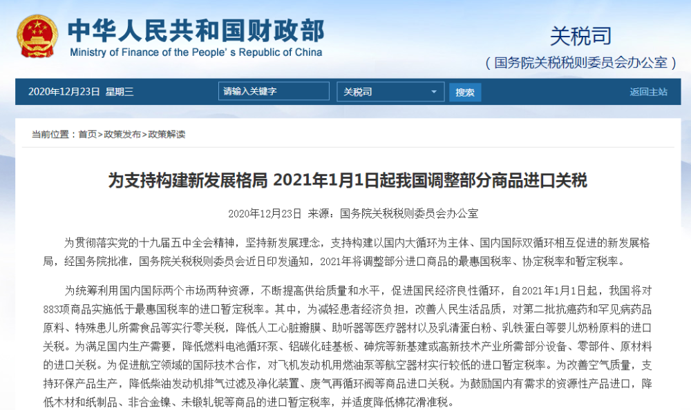 2021年1月1日起我国调整部分商品进口关税