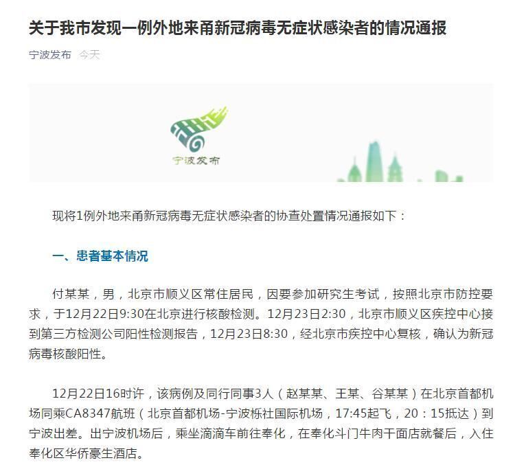 关于宁波市发现一例外地来甬新冠病毒无症状感染者的情况通报
