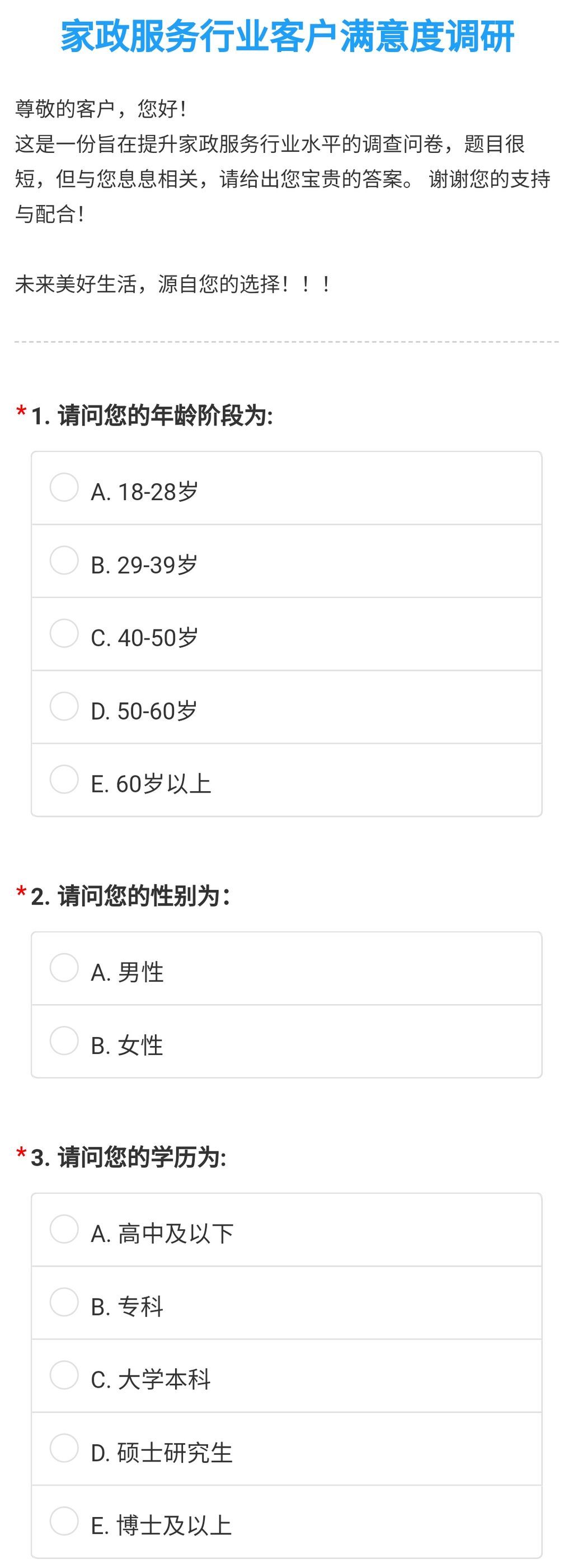 为了解我市家政服务的质量和需求情况,促进我市家政服务业转型升级,市商务局开展家政服务行业客户满意度调研,期待您的参与!