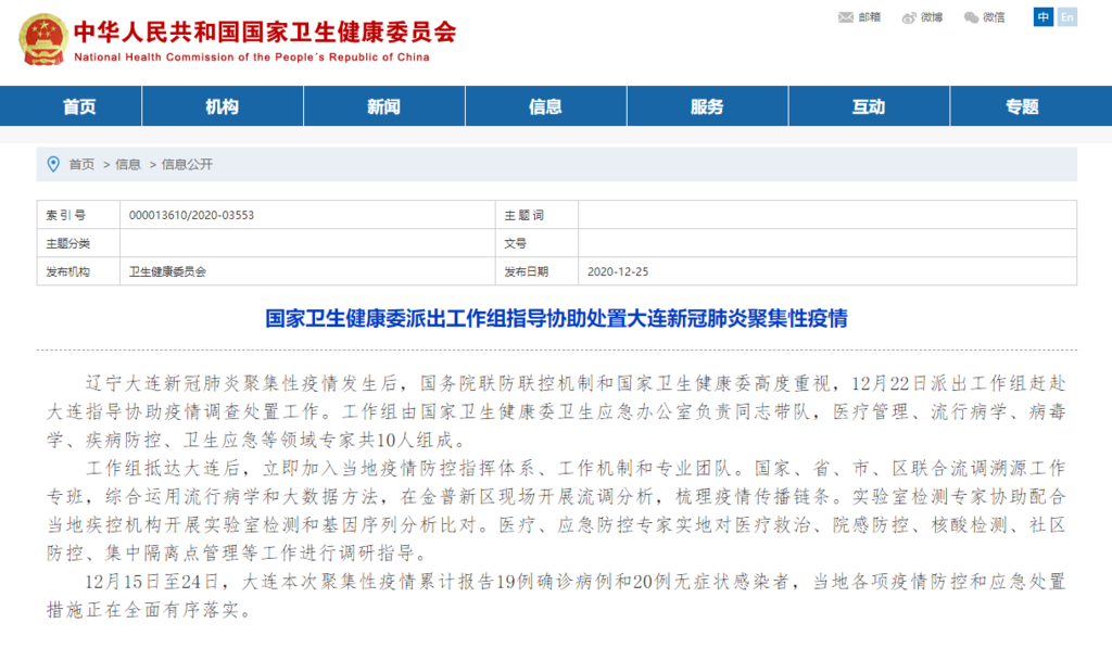 辽宁大连新冠肺炎聚集性疫情发生后,国务院联防联控机制和国家卫生健康委高度重视,12月22日派出工作组赶赴大连指导协助疫情调查处置工作。工作组由国家卫生健康委卫生应急办公室负责同志带队,医疗管理、流行病学、病毒学、疾病防控、卫生应急等领域专家共10人组成。