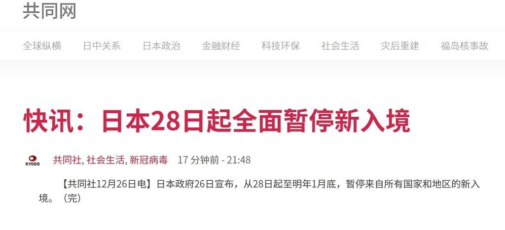 环球网快讯 日本共同社刚刚消息称,日本政府12月26日宣布,从12月28日起至明年1月底,暂停来自所有国家和地区的新入境。