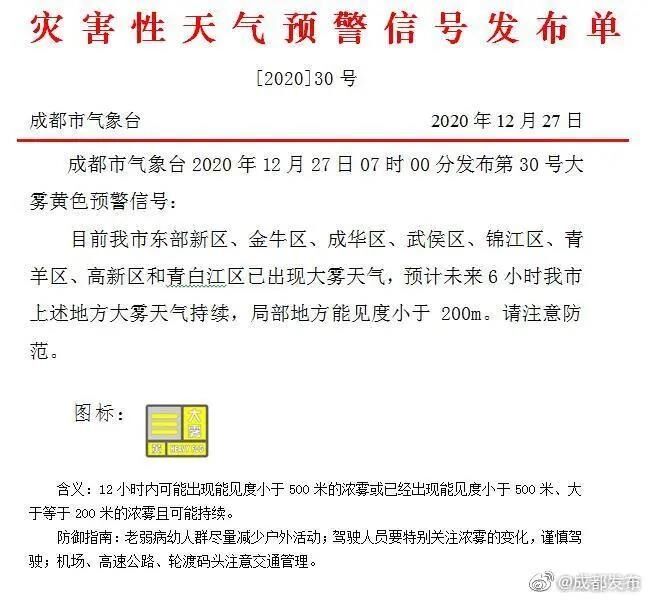 成都市气象台2020年12月27日07时00分发布第30号大雾黄色预警信号: