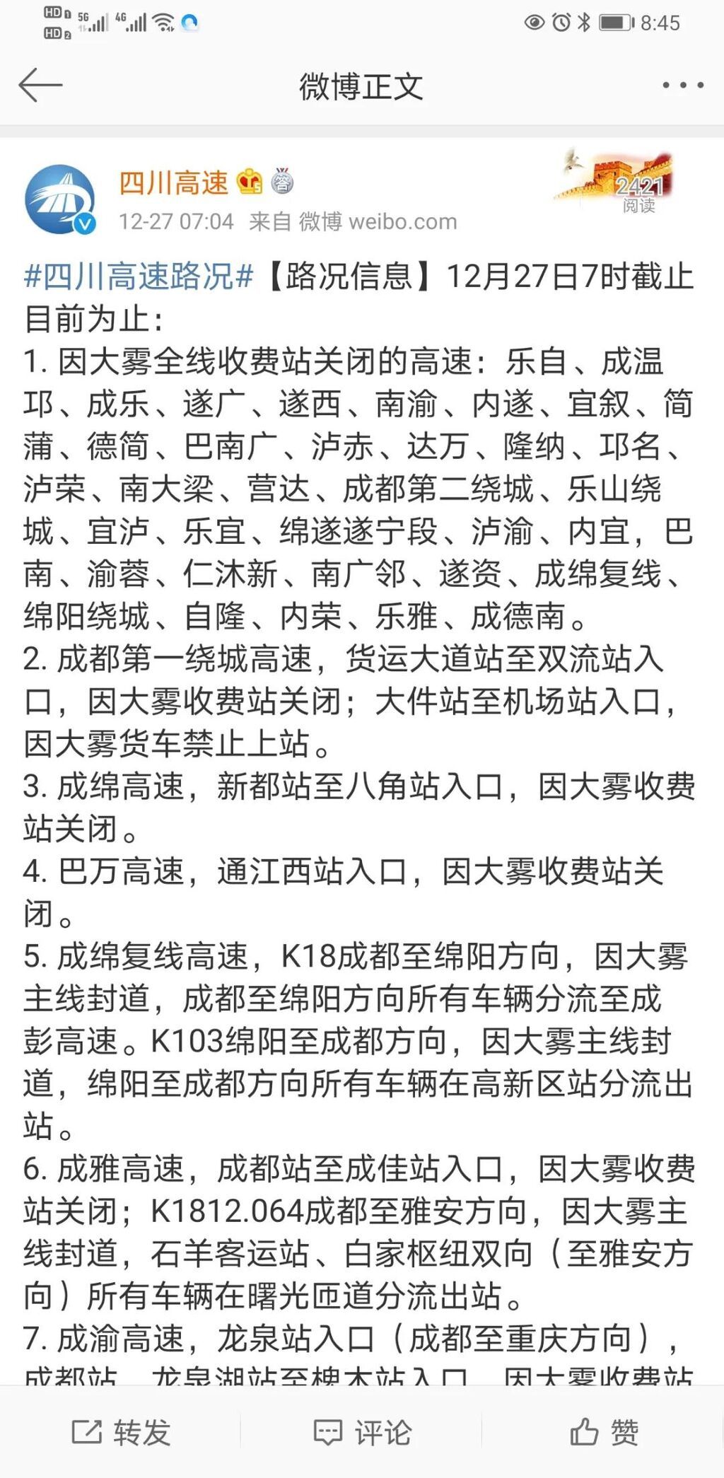 8. 成南高速,成都站入口,因大雾只有一根车道通行;义和站至仓山站、大通站至南充东站入口,因大雾收费站关闭。