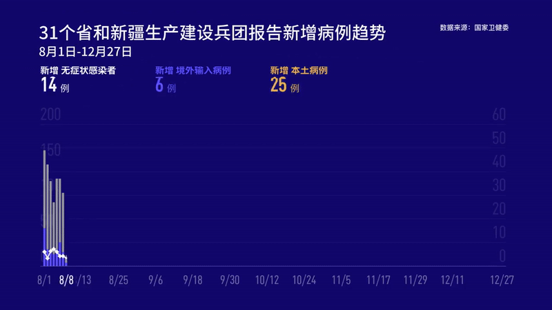 31个省(自治区、直辖市)和新疆生产建设兵团报告新增无症状感染者20例(境外输入16例);当日转为确诊病例4例(境外输入3例);当日无解除医学观察无症状感染者;尚在医学观察无症状感染者267例(境外输入219例)。