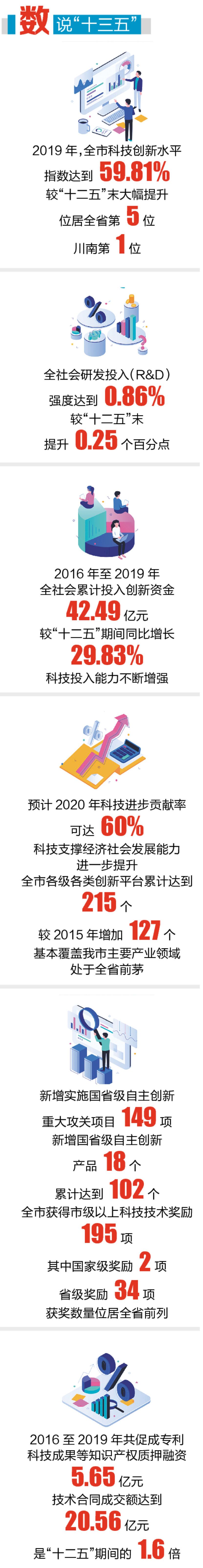 2019年,全市科技创新水平指数达到59.81%,较“十二五”末有大幅提升,位居全省第5位、川南第1位;2016年至2019年全社会累计投入创新资金42.49亿元,较“十二五”期间同比增长29.83%;预计2020年科技进步贡献率可达到60%,科技支撑经济社会发展能力进一步提升……