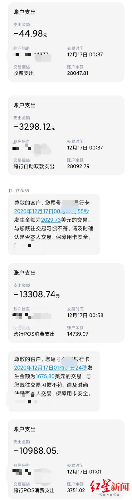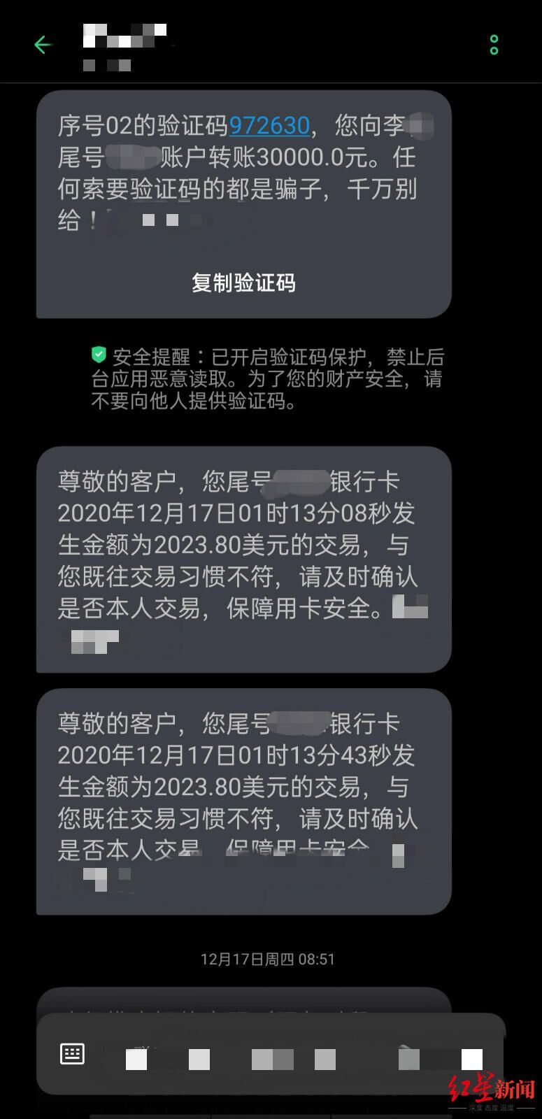李女士则是凌晨就发现了情况。她告诉红星新闻记者,自己当时正在看剧,注意到手机交易短信时,起初以为是诈骗信息,“仔细看后发现确实是某银行发来的。”接着便是连续的交易短信,她又查看了某银行APP,扣款确实发生了,交易地点显示在美国。意识到可能遭遇了盗刷,她赶紧开始转移卡内余额。“刚刚把3万块钱转出来,就又来了一条新的扣费信息。”记者注意到,这条4块钱的扣费名目为“境外银联查询手续费”。
