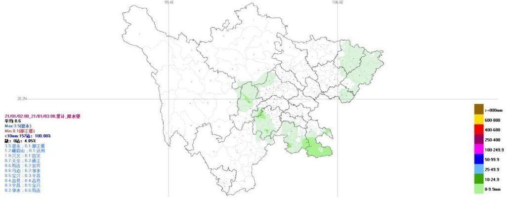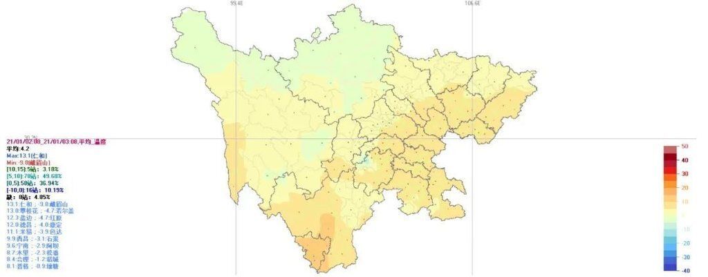 昨天08时到今天08时,盆地最低气温西北部1~3度,其余地方4~5度;最高气温5~9度。