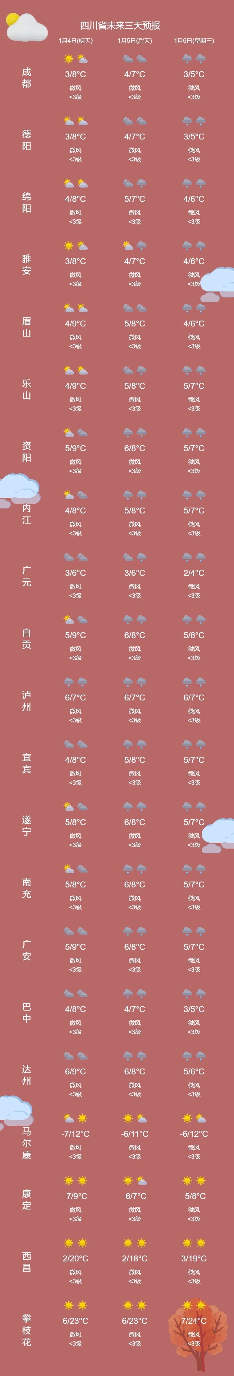 24小时内,盆地最低气温:3~5℃;最高气温:8~10℃。