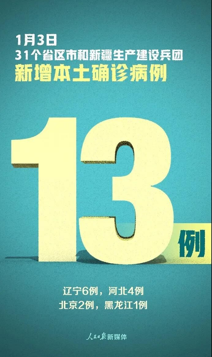 1月3日0—24时,31个省(自治区、直辖市)和新疆生产建设兵团报告新增确诊病例33例,其中境外输入病例20例(陕西6例,上海4例,四川3例,广东2例,天津1例,山西1例,内蒙古1例,辽宁1例,福建1例),本土病例13例(辽宁6例,河北4例,北京2例,黑龙江1例);无新增死亡病例;无新增疑似病例。