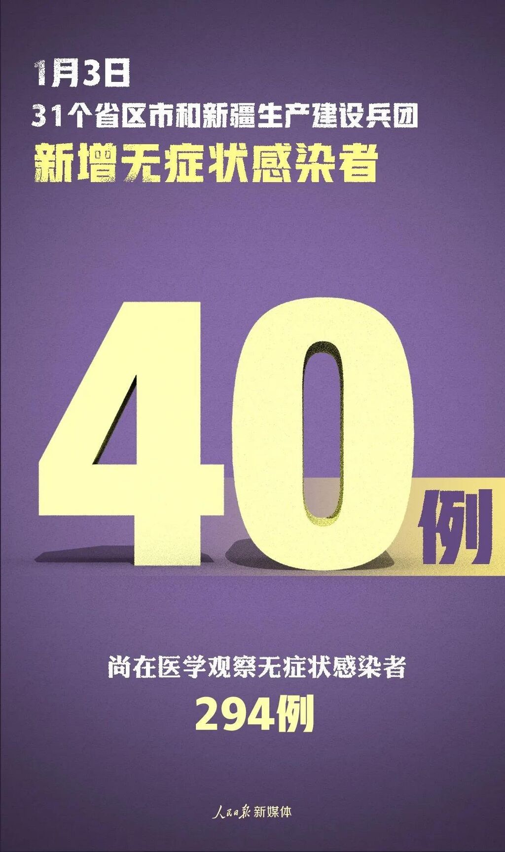 31个省(自治区、直辖市)和新疆生产建设兵团报告新增无症状感染者40例(境外输入26例);当日转为确诊病例4例(境外输入3例);当日解除医学观察11例(境外输入8例);尚在医学观察无症状感染者294例(境外输入240例)。