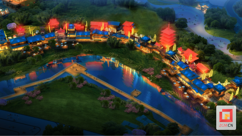 《盐街灯市》能使游客身临其境感受唐朝文化,它将是一座栉比鳞次的大唐宫房群落与现代结构派灯雕楼宇相融合的唐梦街景。在蜿蜒的《梦幻河湾》边上,一幅幽幽古风的画卷在这里展开。以掌灯报时“十二时辰”为设计理念,每个时辰对应一盏灯,在各个建筑之间,营造出灯火辉煌、如梦如幻的繁华街景。