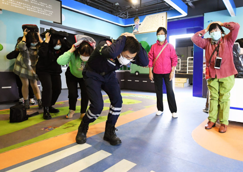 2020年10月13日,当日是国际减灾日,在北京中关村街道安全宣教基地,工作人员指导居民学习地震应急逃生。新华社记者 任超 摄