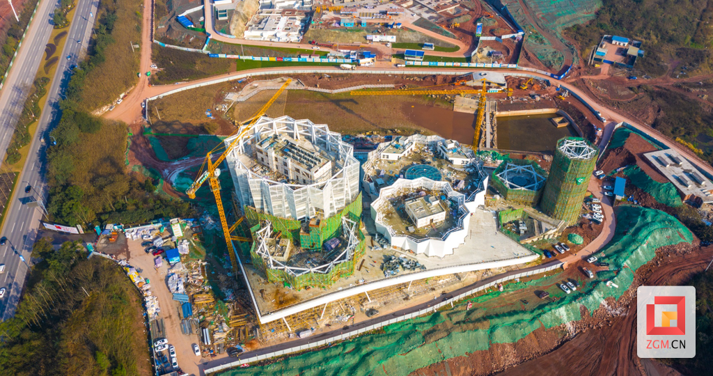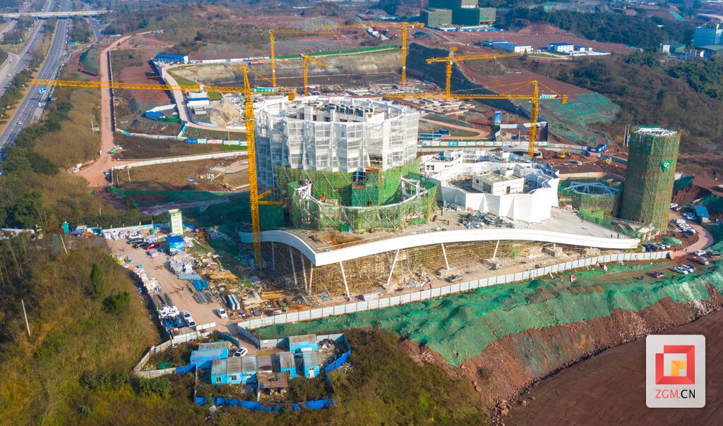据悉,展览中心一期工程自2018年4月开工以来,已完成投资3.7亿元,展览馆、城市书吧、多功能会议厅和45米高的观光塔主体工程建设完成。“主楼玻璃外壳表面呈折面,暗喻井盐晶体,夜晚通过灯光组织,宛若一组灯组,又与自贡千年盐都此起彼伏、高耸的井盐天车形成含蓄的关联,裙楼屋面做成动感的掀起造型,神似恐龙躯体。”据城投集团展览中心项目技术负责人胡一非介绍,展览中心建筑设计方案整体充分利用地形地貌,几座异形结构的钢筋水泥建筑物也特别具有标志性,体现“盐龙灯”地域文化和丘陵特色。“目前有200余名工程建设人员在加班加点进行办公楼的内部装饰、室外景观楼梯架设、网架屋面工程、机电安装工程等,力争如期完成。”