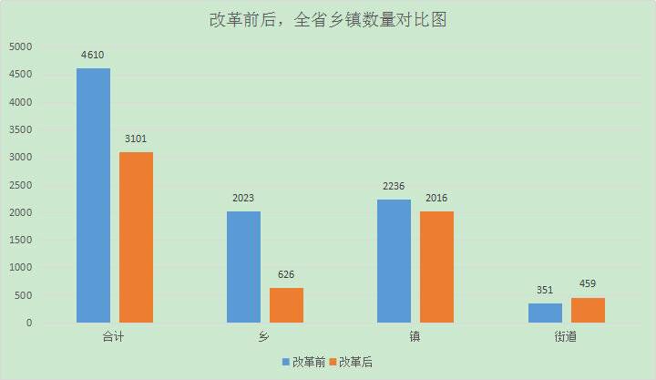 改革前,我省乡级政区数量有4610个,其中街道351个、镇2236个、乡2023个,居全国第一,乡镇设置“数量多、规模小、密度大、实力弱”的现状突出,稀释了公共资源、降低了服务效能、增加了运行成本、制约了经济发展、影响了乡村治理。为破解乡镇微观体系不适应宏观战略、空间布局不适应城镇化进程、管理架构不适应治理能力现代化要求,2019年10月,我省启动乡镇行政区划调整改革。