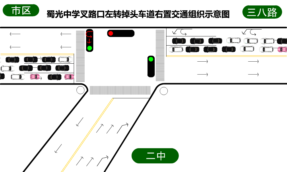 为预防交通事故,缓解蜀光中学至三八路口交通拥堵,提高车道的利用率,减少路段路口掉头空间不足引发的交通拥堵和冲突,自贡自流井交警拟在本月中旬对东盐都大道蜀光中学交叉口东侧入口进行重新交通组织(见动画示意图),将左转和掉头车道合并为最右车道,原左转车道变更为直行车道。