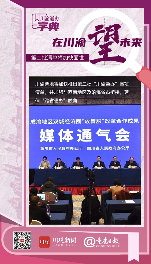 “川渝通办”好消息不断。在四川省政府办公厅和重庆市政府办公厅的共同推动下,去年底,《川渝通办事项清单(第一批)》95个事项全部实现线上全网通办、线下异地可办。今年初,双方又共同印发《成渝地区双城经济圈便捷生活行动方案》。很快,第二批“川渝通办”事项清单又将发布。