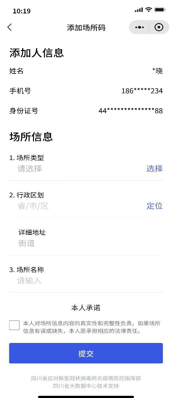 第三步:选择场所类型、地址定位、填写详细地址、场所名称后勾选本人承诺并提交,生成“场所码”。