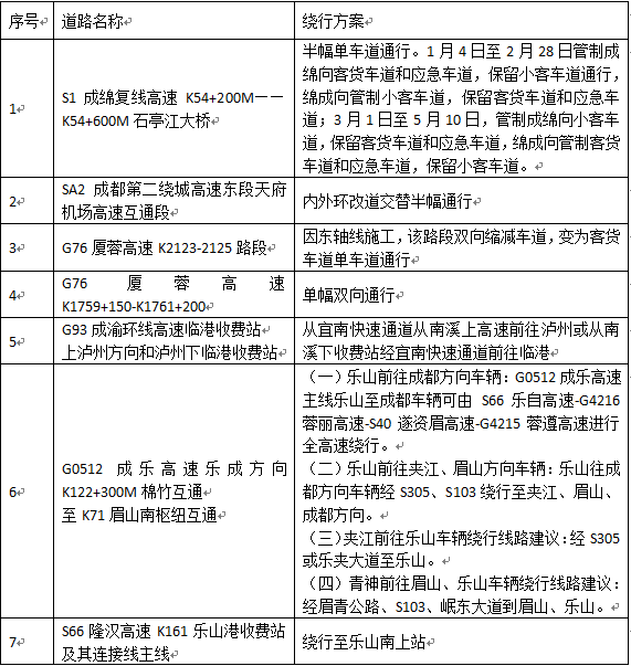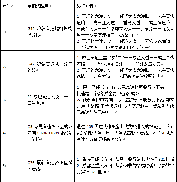 春运期间,成都绕城、成南、成温邛、成巴、成雅、成渝、渝蓉、成自泸、雅康、雅西、内宜等主干高速公路通行压力较大;进出城高速公路和通往景区路线上的隧道、互通立交、收费站、服务区是易拥堵段点。因春节返乡人员较多,县城、乡镇、农村地区车辆骤增,加之县乡道路多狭窄,也易造成拥堵。