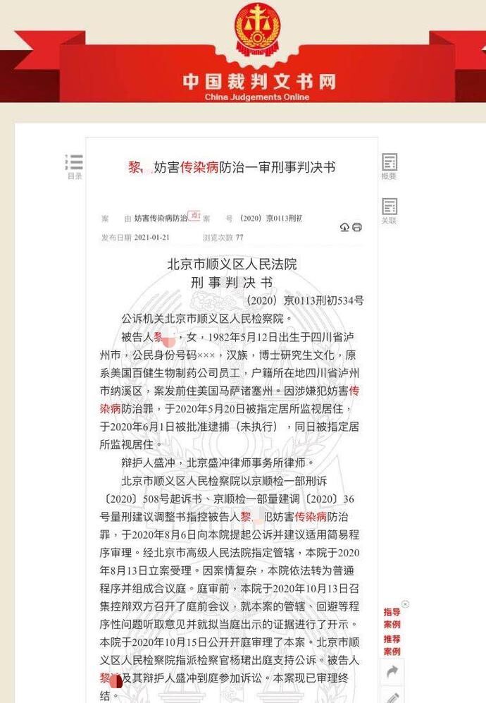 (2020)京0113刑初534号判决书显示,黎某,女,1982年生,博士研究生文化,原系美国百健生物制药公司员工,户籍所在地四川省泸州市,案发前住美国马萨诸塞州。因涉嫌犯妨害传染病防治罪,于2020年5月20日被指定居所监视居住,于2020年6月1日被批准逮捕(未执行),同日被指定居所监视居住。