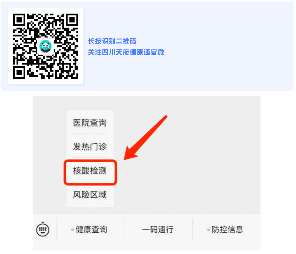 第一步:关注微信公众号“四川天府健康通官微”,点击菜单栏“健康查询”“核酸检测”即可查看附近地区核酸检测机构名称、地址等信息。