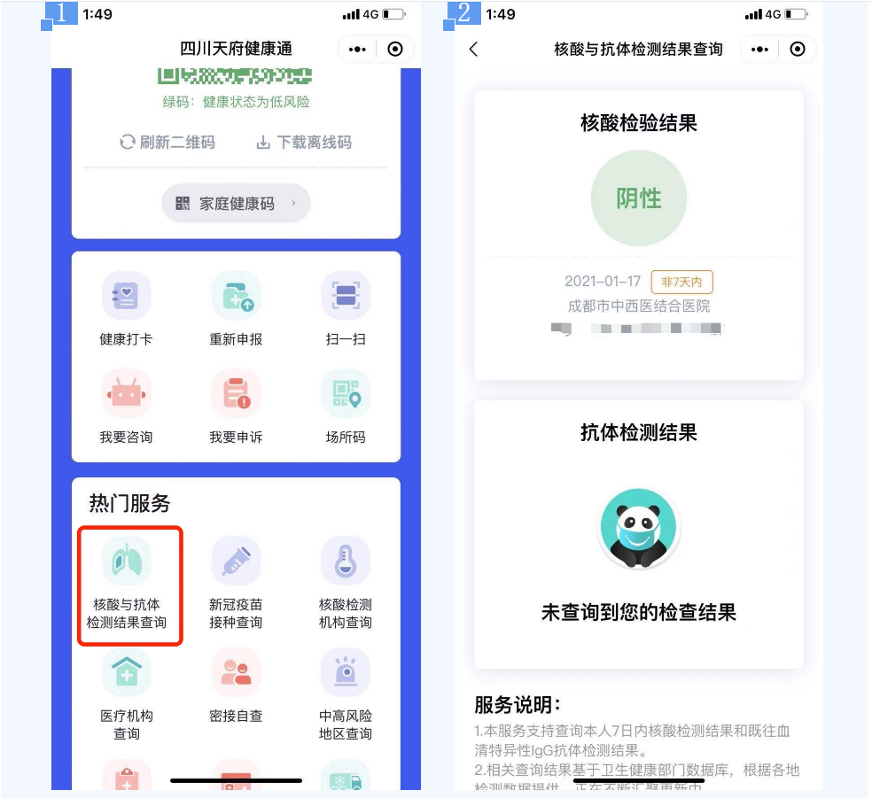 在“四川天府健康通”小程序首页的“热门服务”中,点击“核酸与抗体检测结果查询”,即可查看本人的检测结果。