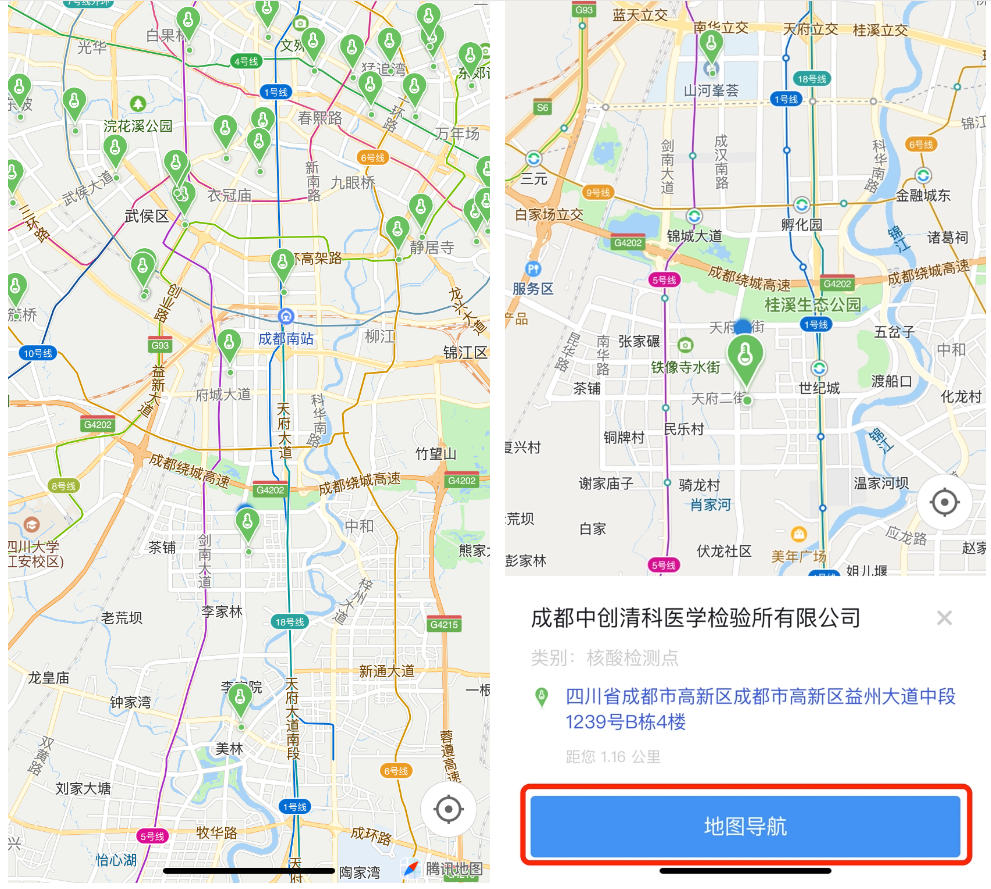 第二步:选择距离较近的核酸检测机构,点击“地图导航”,即可前往。