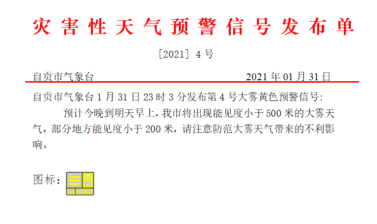 1月31日23时3分,自贡市气象台发布第4号大雾黄色预警信号:预计今晚到明天早上,我市将出现能见度小于500米的大雾天气,部分地方能见度小于200米,请注意防范大雾天气带来的不利影响。