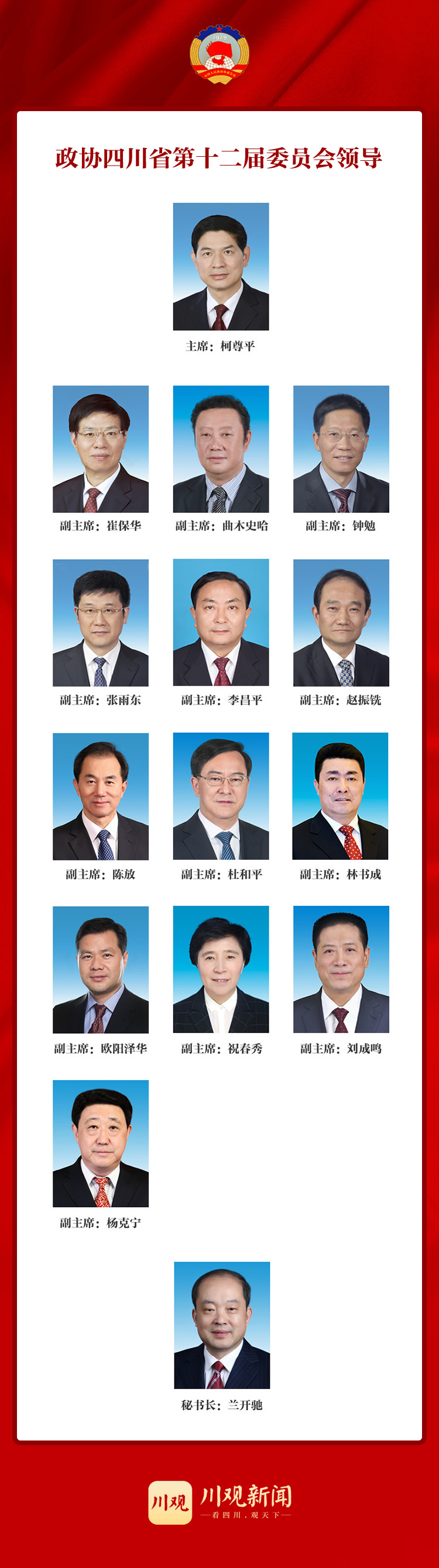 最新!政协四川省第十二届委员会主席、副主席、秘书长全名单(附照片)