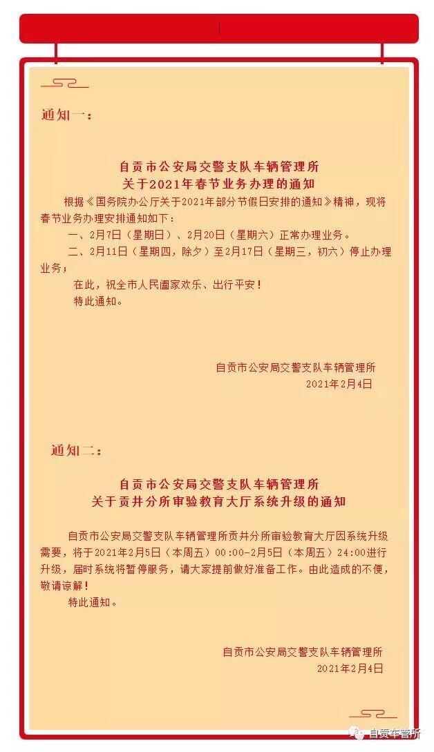 据自贡市公安局交警支队车辆管理所消息,车管所2021年春节业务办理安排如下: