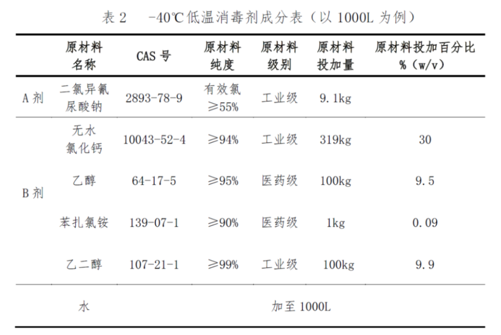 1.主要成分:包括二氯异氰尿酸钠、氯化钙、乙醇、乙二醇和苯扎氯铵。现场使用时,-40℃低温消毒剂中有效氯浓度为0.5%(5000mg/L),无水氯化钙的含量为30%,乙醇9.5%,乙二醇9.9%,苯扎氯铵0.09%。