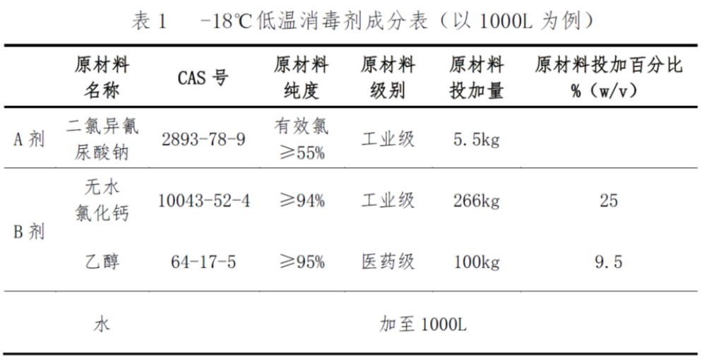 1.主要成分:包括二氯异氰尿酸钠、氯化钙和乙醇。现场使用时,-18℃低温消毒剂中有效氯浓度为0.3%(3000mg/L),无水氯化钙的含量为25%,乙醇的含量为9.5%。