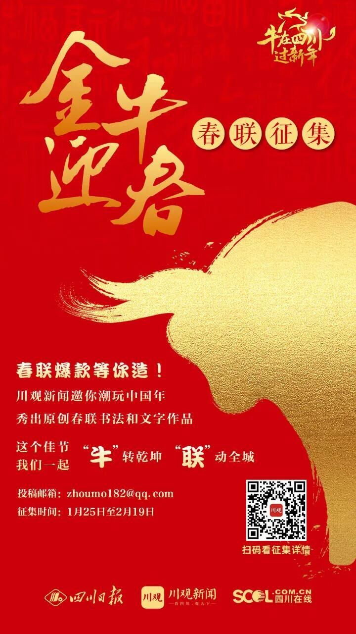爆款春联等你造!即日起至2月19日,川观新闻邀你潮玩中国年,秀出原创春联书法或文字作品。除了对优秀作品进行展播,我们还将设置作品投票区,上演硬核实力PK。这个佳节,我们一起“牛”转乾坤,“联”动全城。(扫码查看征集详情)