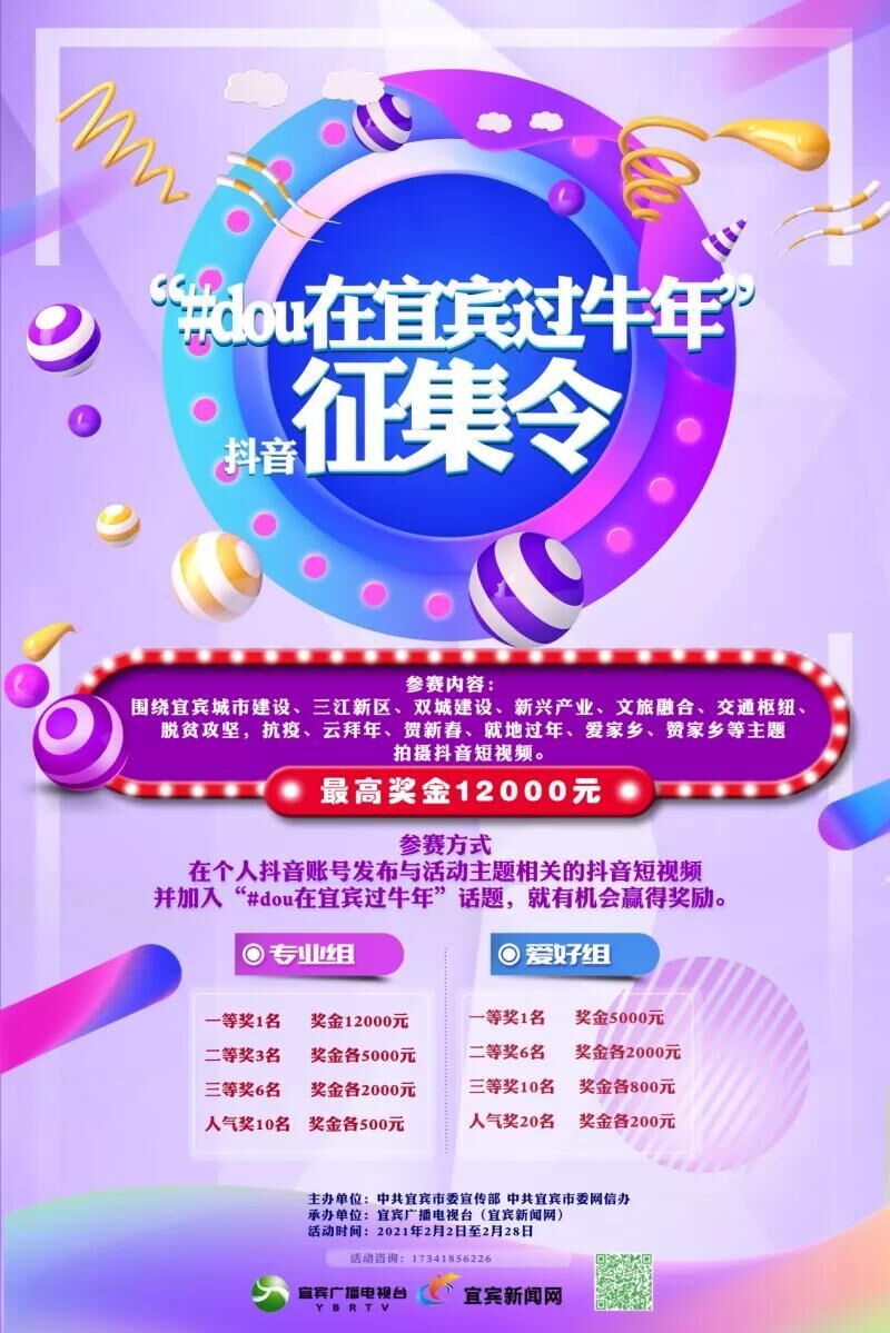 为做好“网络中国节”主题活动,结合“春节”“抗疫”“就地过年”的防疫要求,2月2日,由中共宜宾市委宣传部、中共宜宾市委网信办主办的“#dou在宜宾过牛年”抖音短视频活动开始征集。活动旨在倡导广大市民云拜年、贺新春、晒家乡、赞家乡,向海内外关心关注宜宾发展的社会各界和留在外地过年的宜宾人,生动展示宜宾浓浓年味、城市新貌、产业发展和丰富的旅游文化资源,营造过大年、爱宜宾、爱家乡的浓厚氛围。广大市民朋友们,快拿出你的相机、手机,将身边的年味和美好随手一拍,就有可能与万元大奖美丽邂逅。◆详情请点击