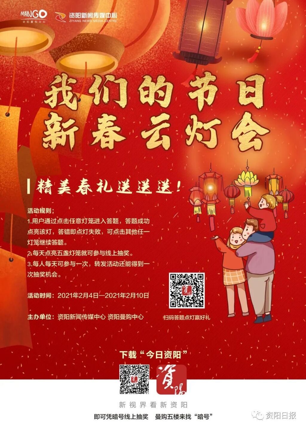 为引导市民了解春节民俗,传播传统文化,2月4日,由资阳新闻传媒中心、资阳曼购中心联合主办的“新春云灯会”线上答题抽奖活动正式上线。通过线上答点亮灯笼,就能赢取品牌多功能锅、品牌榨汁机、品牌洗衣液等大奖哦!立即扫描上方二维码,参与活动,答题点亮灯笼,精美春礼就是你的!(扫码参加线上答题)
